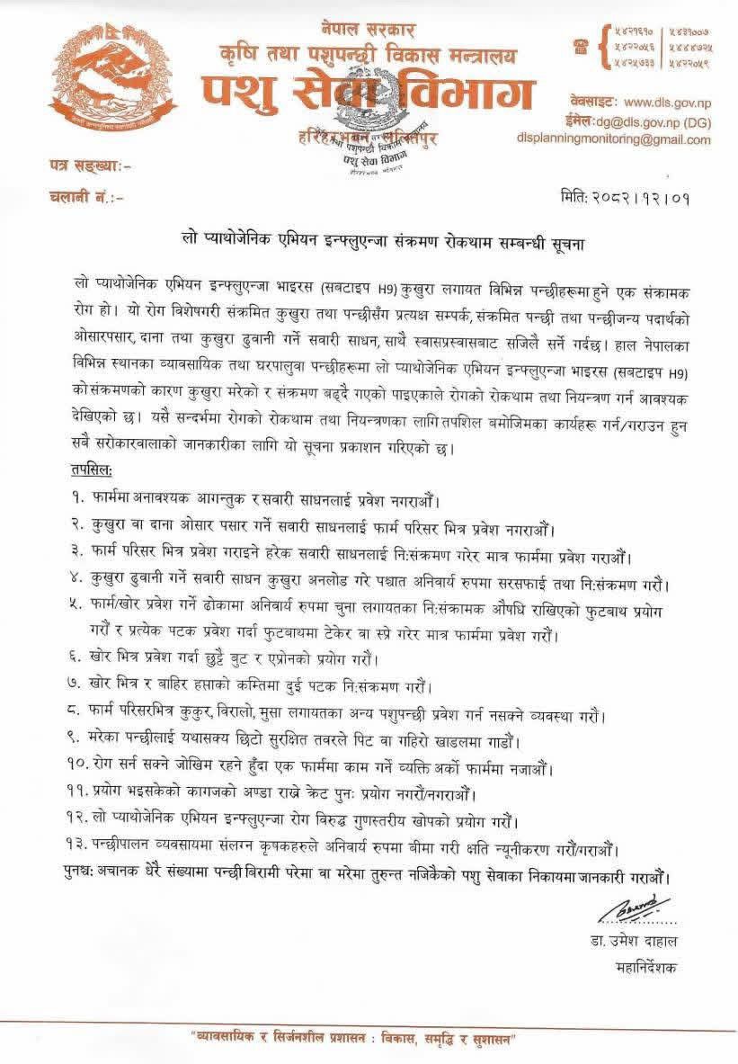 कुनै फार्ममा अचानक धेरै कुखुरा बिरामी पर्ने वा मर्ने अवस्था देखिएमा नजिकको पशु सेवा कार्यालयलाई तुरुन्त जानकारी गराउन विभागले किसानहरूलाई आग्रह गरेको छ। समयमै सूचना प्राप्त भएमा परीक्षण, निगरानी र नियन्त्रण कार्य प्रभावकारी रूपमा सञ्चालन गर्न सकिने विश्वास विभागले व्यक्त गरेको छ।