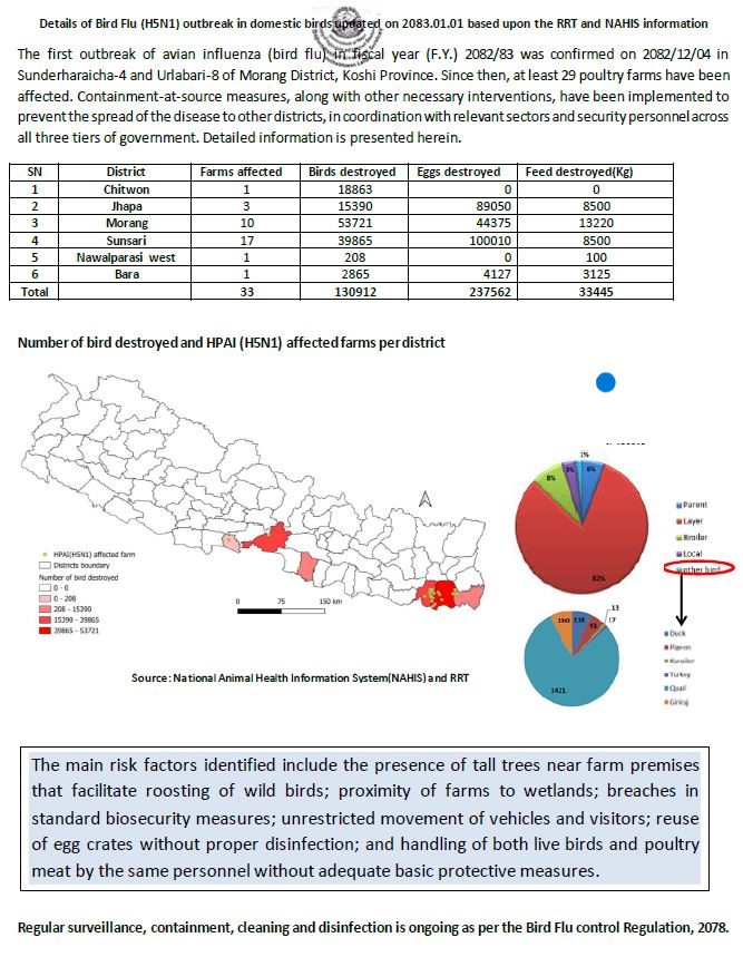 नेपालमा बर्डफ्लु संक्रमणले फेरि ठूलो चुनौती थपेको छ। पछिल्लो तथ्यांकअनुसार विभिन्न जिल्लामा फैलिएको यो रोगका कारण ठूलो क्षति भएको छ भने नियन्त्रणका प्रयास जारी छन्।